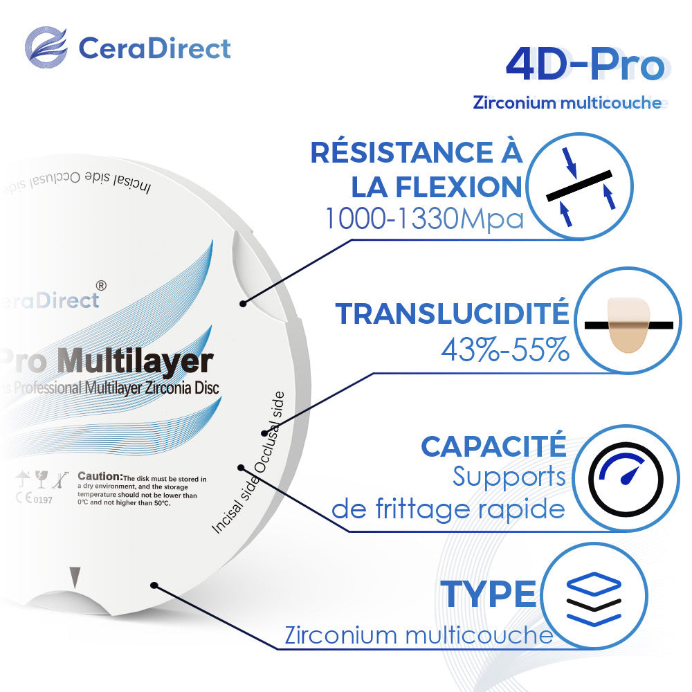 Ceradirect 4D-Pro Multilayer Zirconia est un matériau de restauration dentaire avec un effet esthétique élevé, très proche de l'effet des dents naturelles, et ne nécessite qu'une opération simple pour obtenir d'excellents résultats. Le 4D-Pro Multilayer prend également en charge le frittage rapide, ce qui réduit considérablement le temps de traitement et augmente l'efficacité. Utiliser avec la pâte FlowArt pour obtenir de meilleurs résultats.