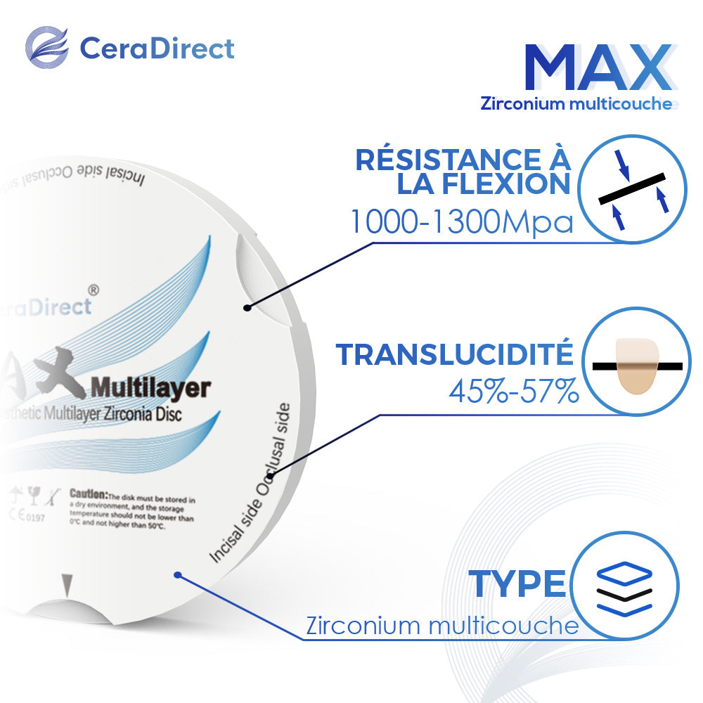 Ceradirect Max Multilayer utilise la dernière technologie de fusion pour obtenir une graduation sans couches d'intensité, de transparence et de couleur. C'est un véritable matériau bionique, grâce à sa bonne résistance et transparence, il peut s'adapter à n'importe quel cas clinique. Un simple découpage et frittage sont nécessaires pour obtenir un cas parfait, avec de la pâte FlowArt pour de meilleurs résultats.