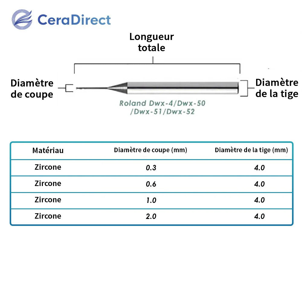 Ceradirect propose des fraises en zircone, des fraises en céramique vitreuse, des fraises en résine, des fraises en métal et d'autres types de fraises. La fraise est fabriquée à partir de matériau en alliage dur à grains ultrafins, ce qui améliore la durée de vie de la fraise, et elle offre une haute précision, une qualité stable et un tranchant affûté. Bonne évacuation des copeaux, résistance à l'usure et haute efficacité de traitement.